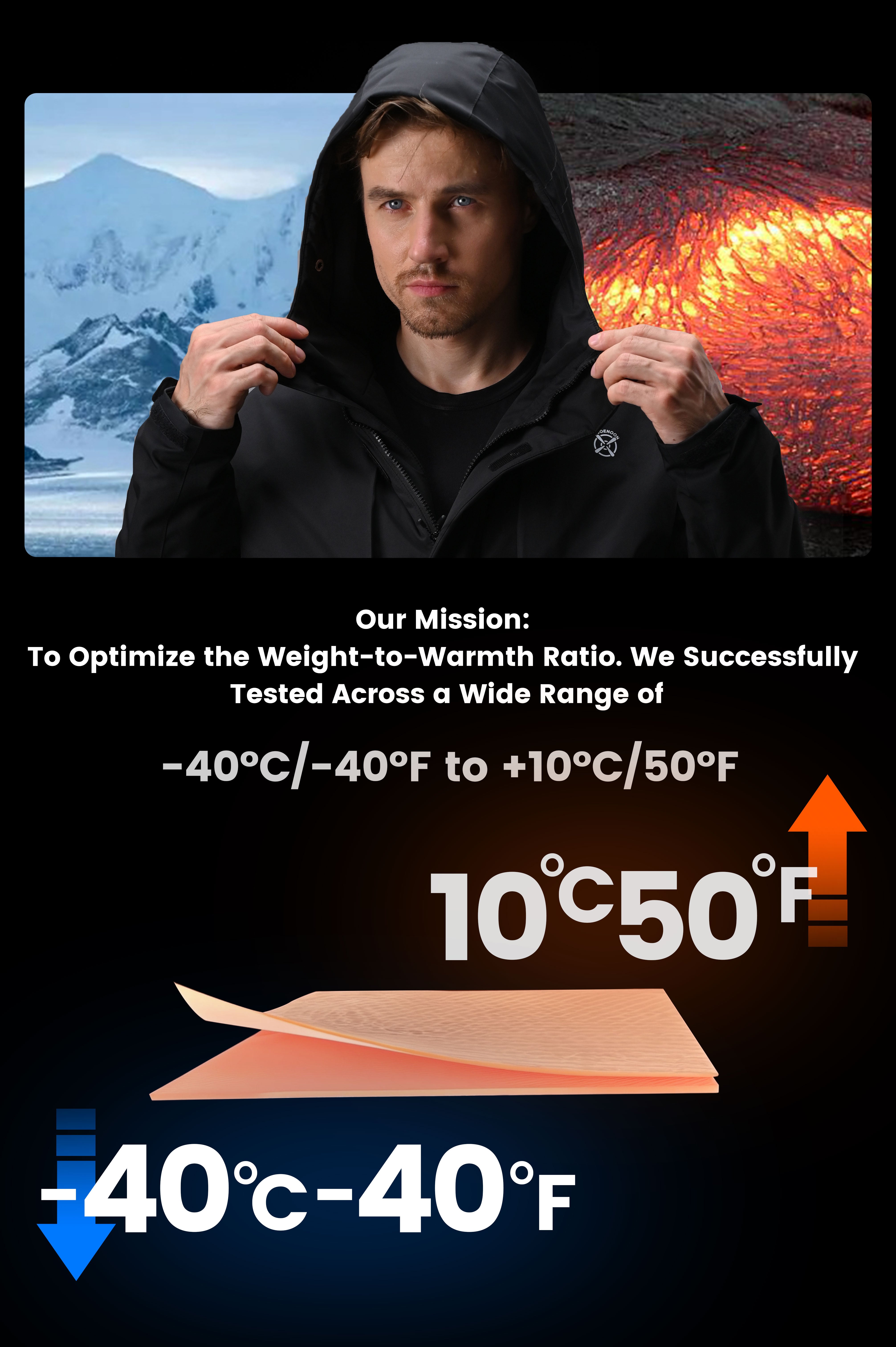 We've spent three years engineering a solution that adapts to you: aerospace-grade materials that provide maximum warmth at minimum weight, smart design that transitions seamlessly from outdoor adventures to urban environments, and accessible pricing that makes advanced technology available to everyone.